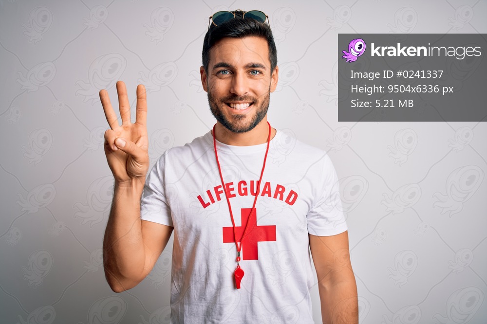Young handsome lifeguard man with beard wearing t-shirt with red cross and whistle showing and pointing up with fingers number three while smiling confident and happy. - Kraken Images