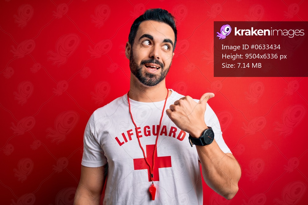 Young handsome lifeguard man with beard wearing whistle over isolated red background smiling with happy face looking and pointing to the side with thumb up. - Kraken Images