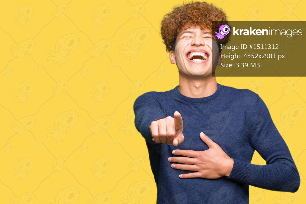 Young handsome man with afro hair Laughing of you, pointing to the camera with finger hand over chest, shame expression