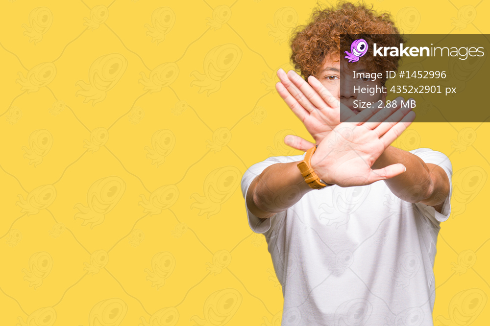 Young handsome man with afro hair wearing casual white t-shirt Rejection expression crossing arms and palms doing negative sign, angry face