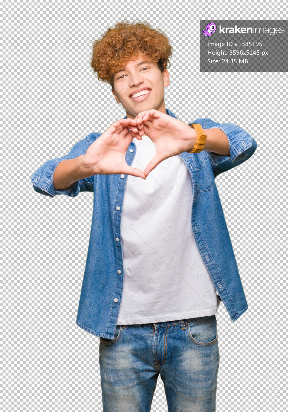 Young handsome man with afro hair wearing denim jacket smiling in love showing heart symbol and shape with hands. Romantic concept.