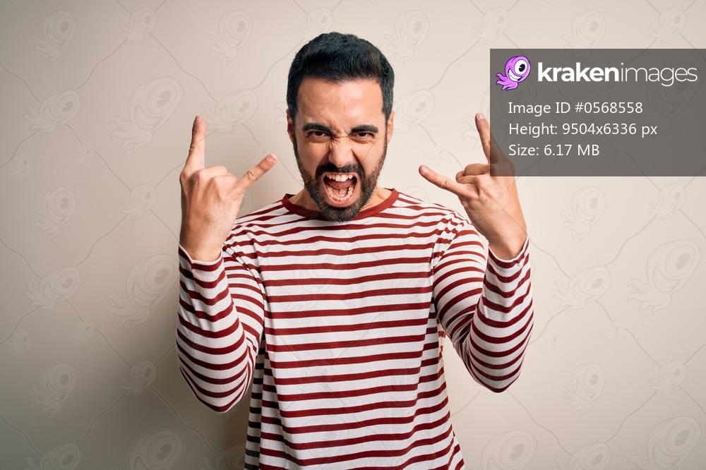 Young handsome man with beard wearing casual striped t-shirt standing over white background shouting with crazy expression doing rock symbol with hands up. Music star. Heavy concept. - Kraken Images