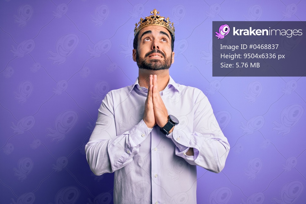 Young handsome man with beard wearing golden crown of king over purple background begging and praying with hands together with hope expression on face very emotional and worried. Begging. - Kraken Images