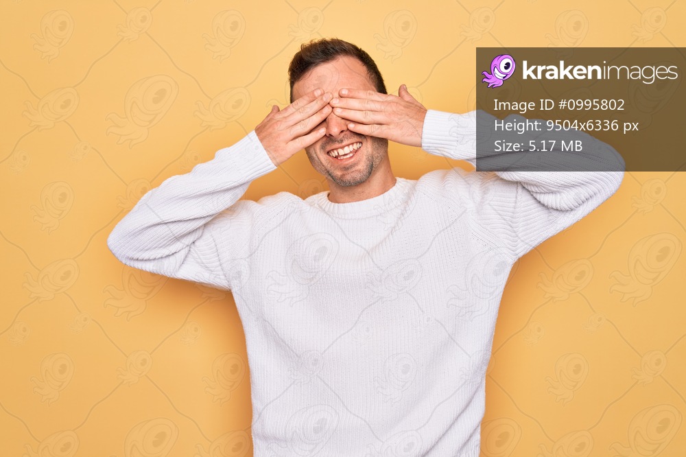 Young handsome man with blue eyes wearing casual sweater standing over yellow background covering eyes with hands smiling cheerful and funny. Blind concept. - Kraken Images