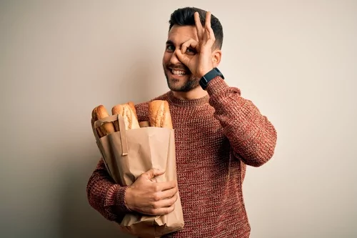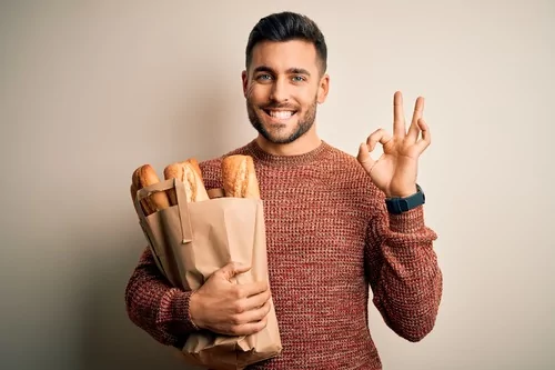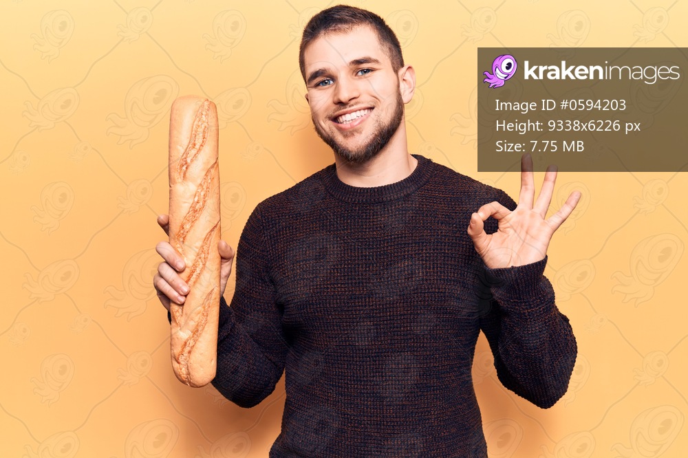 Young handsome man holding baguette doing ok sign with fingers, smiling friendly gesturing excellent symbol