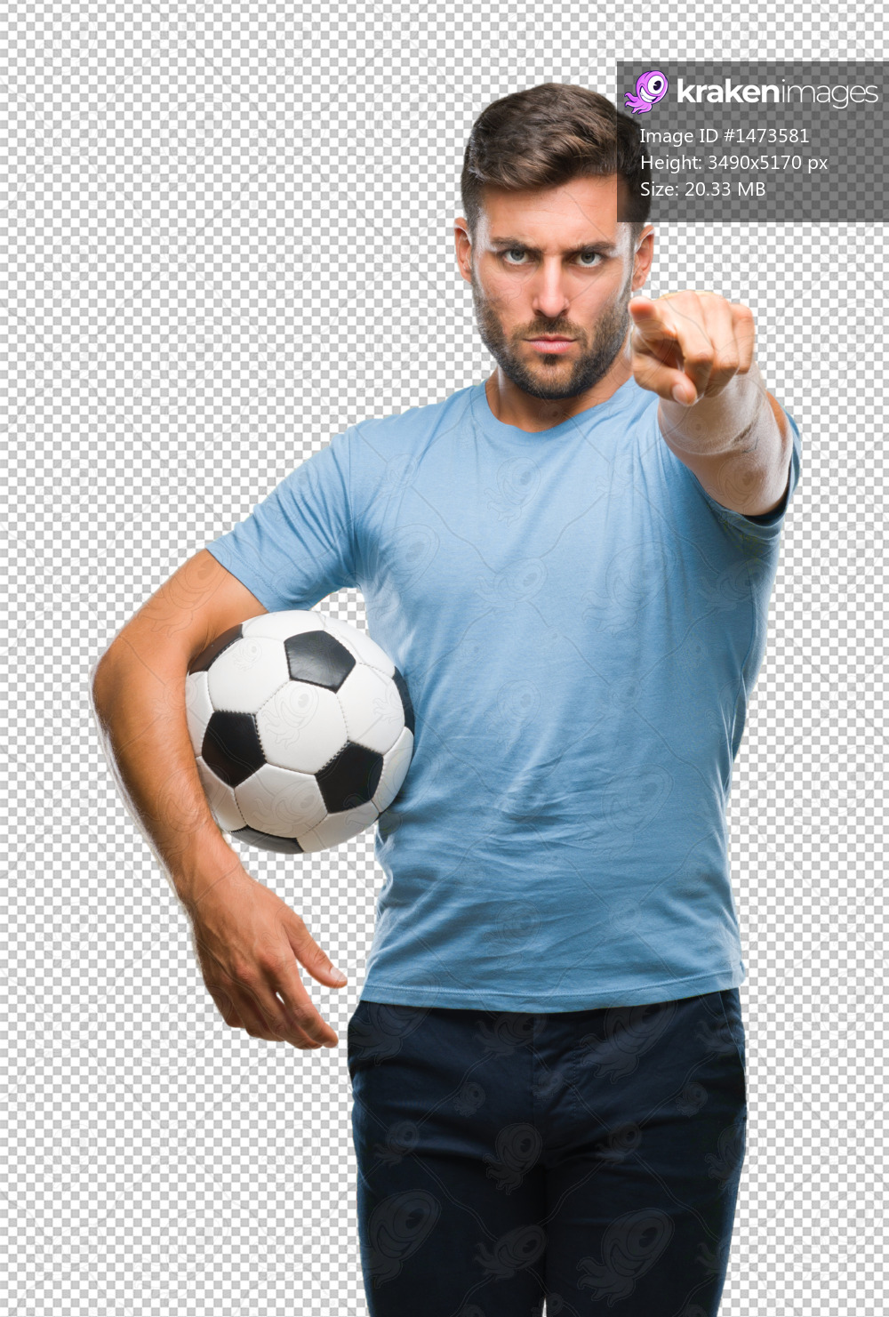 Young handsome man holding soccer football ball over isolated background pointing with finger to the camera and to you, hand sign, positive and confident gesture from the front - Kraken Images