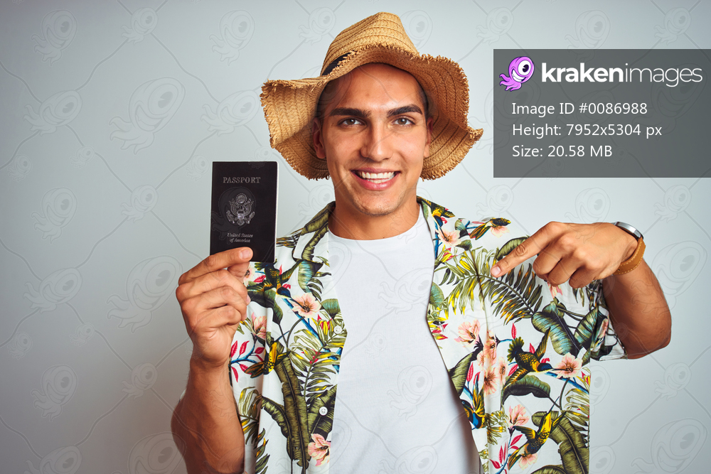 Young handsome man holding United States passport over white isolated background with surprise face pointing finger to himself