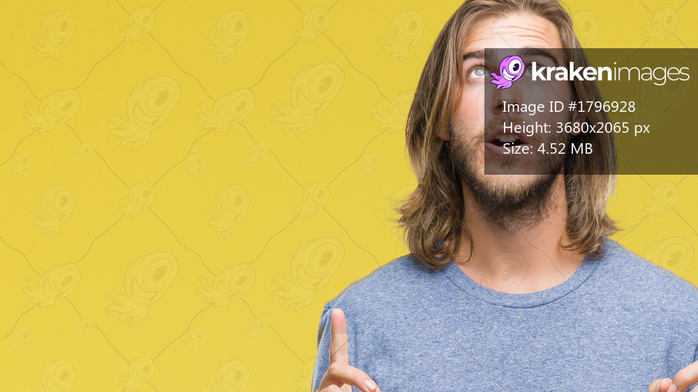 Young handsome man with long hair over isolated background amazed and surprised looking up and pointing with fingers and raised arms.