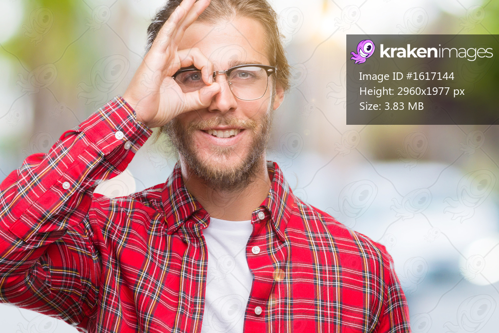 Young handsome man with long hair wearing glasses over isolated background doing ok gesture with hand smiling, eye looking through fingers with happy face. - Kraken Images