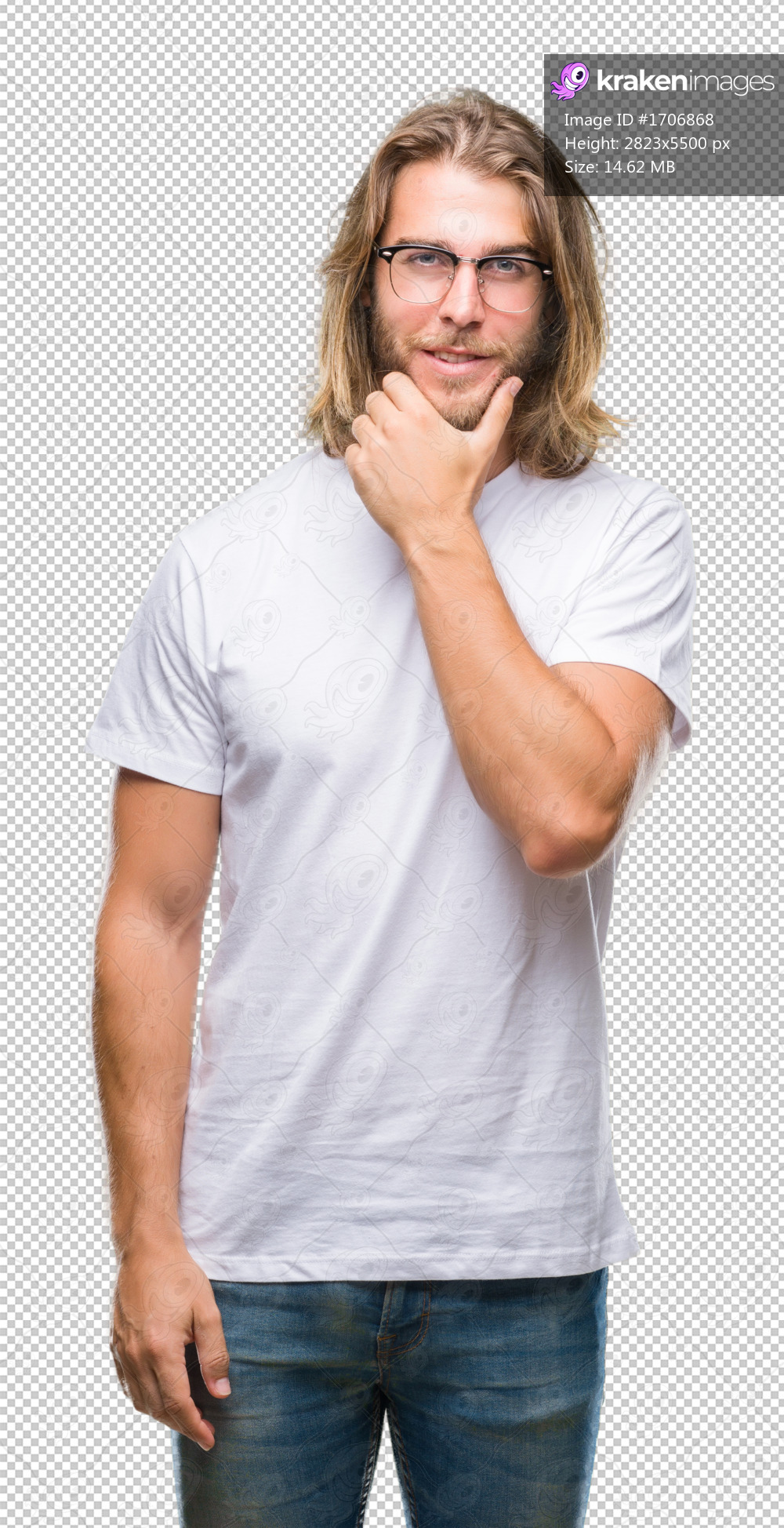 Young handsome man with long hair wearing glasses over isolated background looking confident at the camera with smile with crossed arms and hand raised on chin. Thinking positive. - Kraken Images