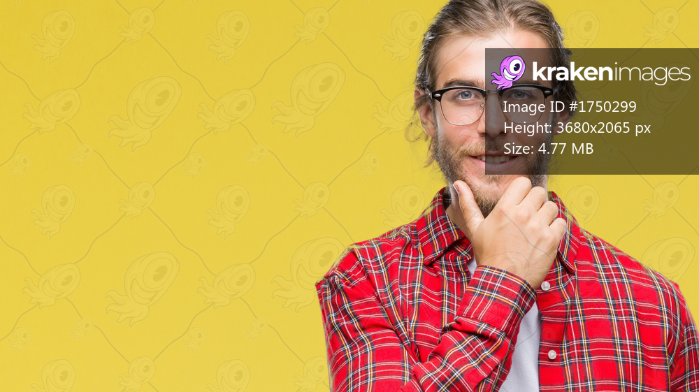 Young handsome man with long hair wearing glasses over isolated background looking confident at the camera with smile with crossed arms and hand raised on chin. Thinking positive. - Kraken Images