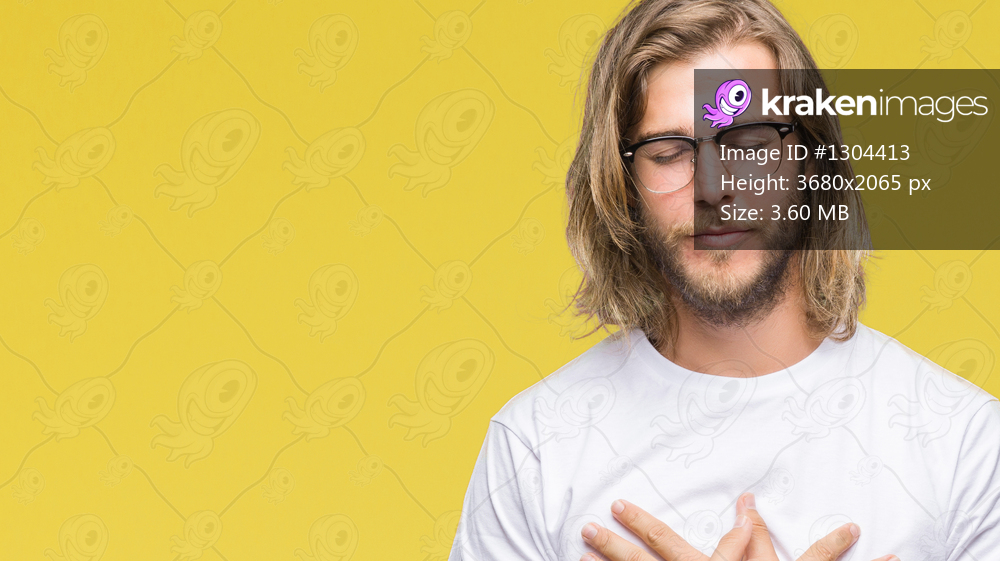 Young handsome man with long hair wearing glasses over isolated background smiling with hands on chest with closed eyes and grateful gesture on face. Health concept. - Kraken Images