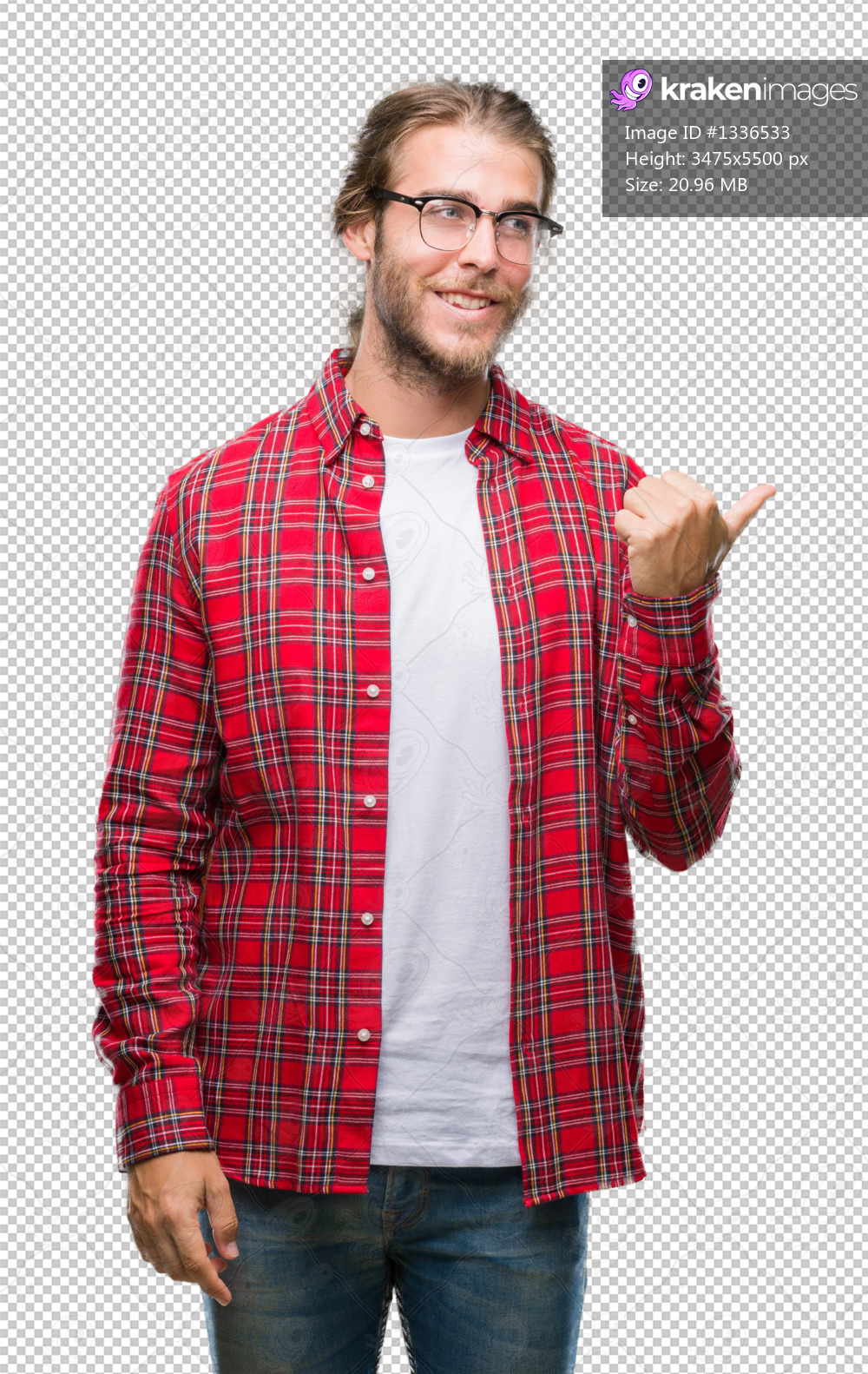 Young handsome man with long hair wearing glasses over isolated background smiling with happy face looking and pointing to the side with thumb up.