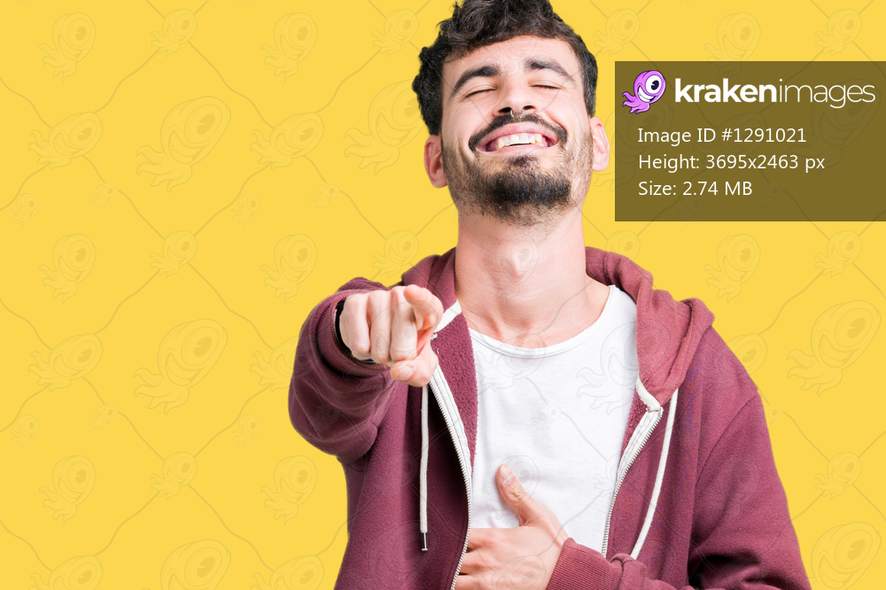 Young handsome man over isolated background Laughing of you, pointing to the camera with finger hand over chest, shame expression