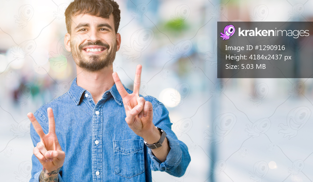 Young handsome man over isolated background smiling looking to the camera showing fingers doing victory sign. Number two.
