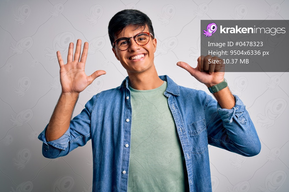 Young handsome man wearing casual shirt and glasses over isolated white background showing and pointing up with fingers number six while smiling confident and happy. - Kraken Images