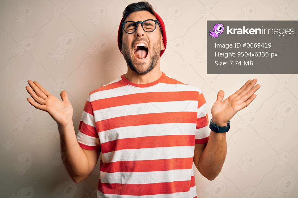 Young handsome man wearing casual striped t-shirt and glasses over white background celebrating mad and crazy for success with arms raised and closed eyes screaming excited. Winner concept - Kraken Images