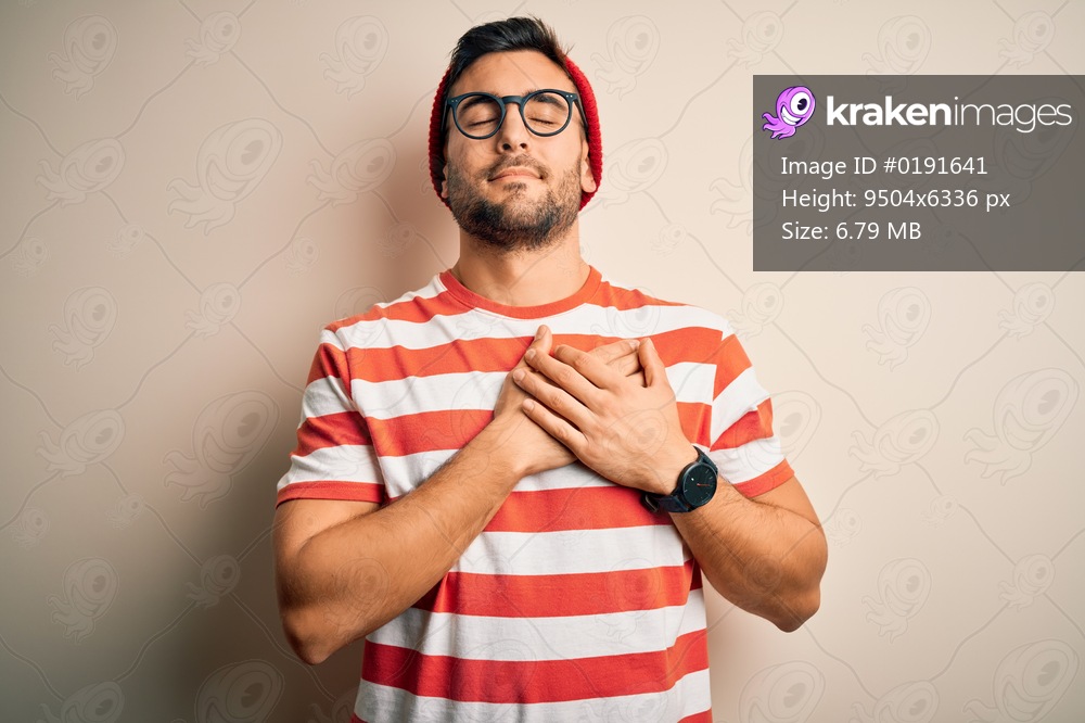 Young handsome man wearing casual striped t-shirt and glasses over white background smiling with hands on chest with closed eyes and grateful gesture on face. Health concept. - Kraken Images