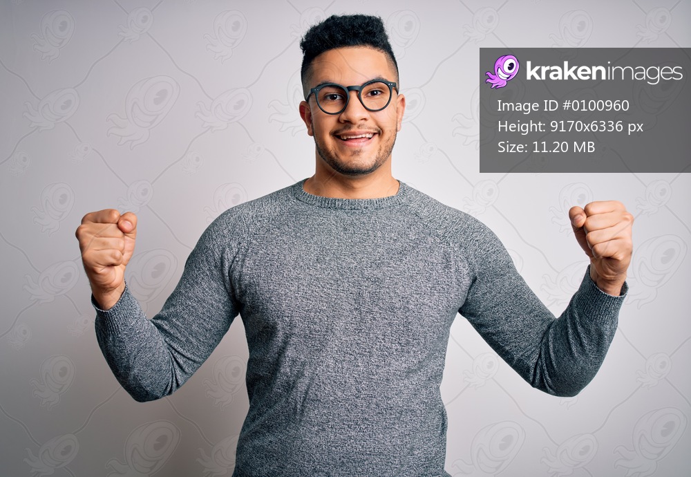 Young handsome man wearing casual sweater and glasses over isolated white background celebrating surprised and amazed for success with arms raised and open eyes. Winner concept. - Kraken Images