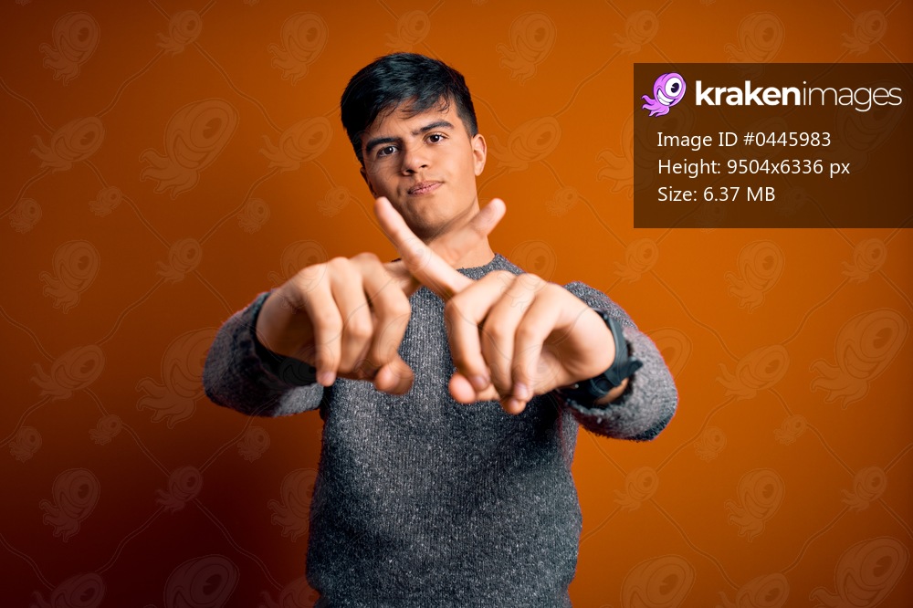 Young handsome man wearing casual sweater standing over isolated orange background Rejection expression crossing fingers doing negative sign