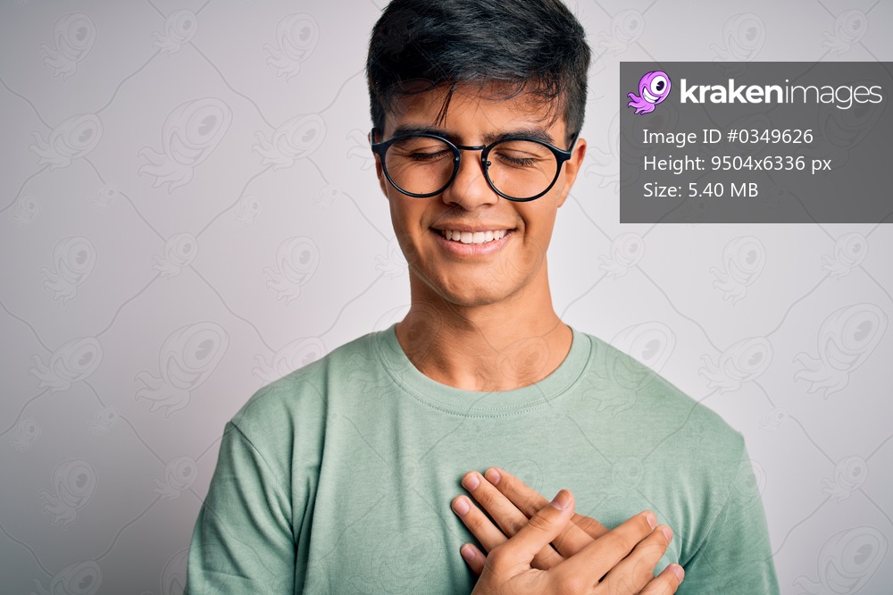 Young handsome man wearing casual t-shirt and glasses over isolated white background smiling with hands on chest with closed eyes and grateful gesture on face. Health concept. - Kraken Images
