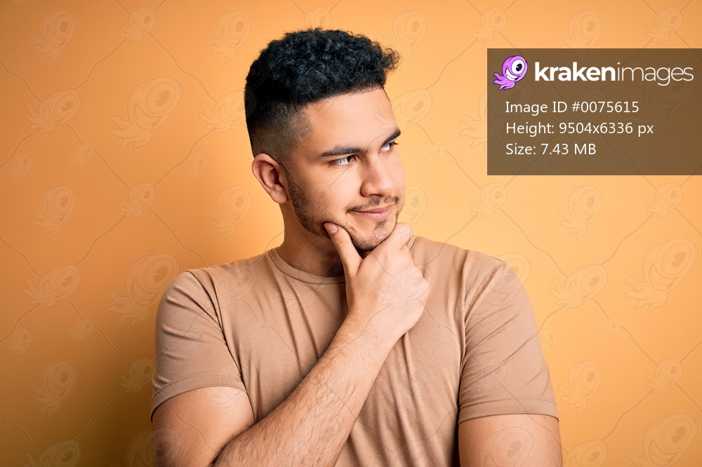 Young handsome man wearing casual t-shirt standing over isolated yellow background with hand on chin thinking about question, pensive expression. Smiling with thoughtful face. Doubt concept. - Kraken Images