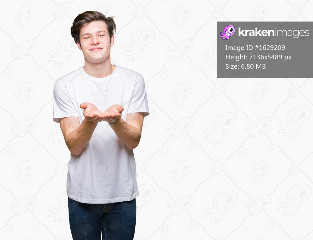 Young handsome man wearing casual white t-shirt over isolated background Smiling with hands palms together receiving or giving gesture. Hold and protection - Kraken Images