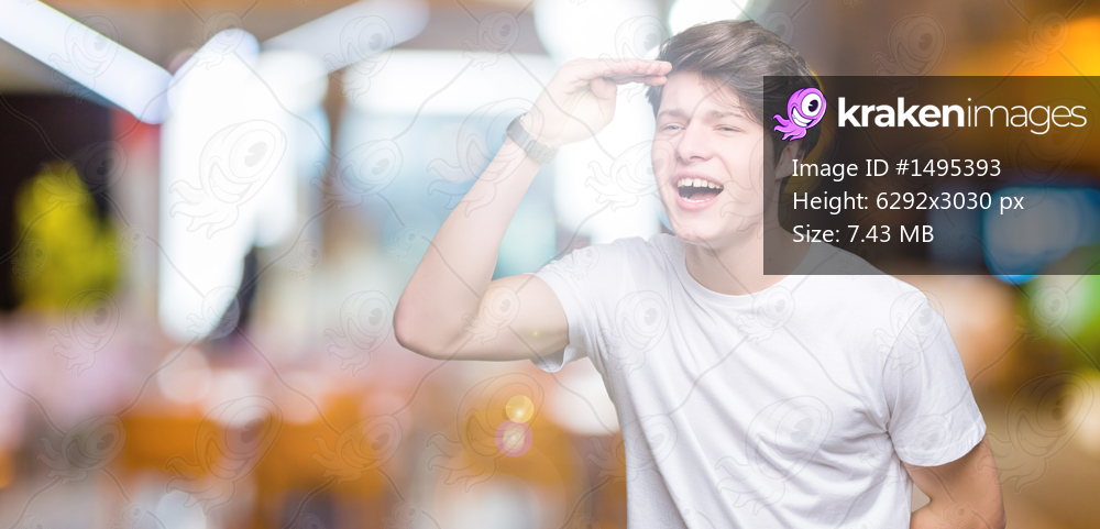 Young handsome man wearing casual white t-shirt over isolated background very happy and smiling looking far away with hand over head. Searching concept. - Kraken Images
