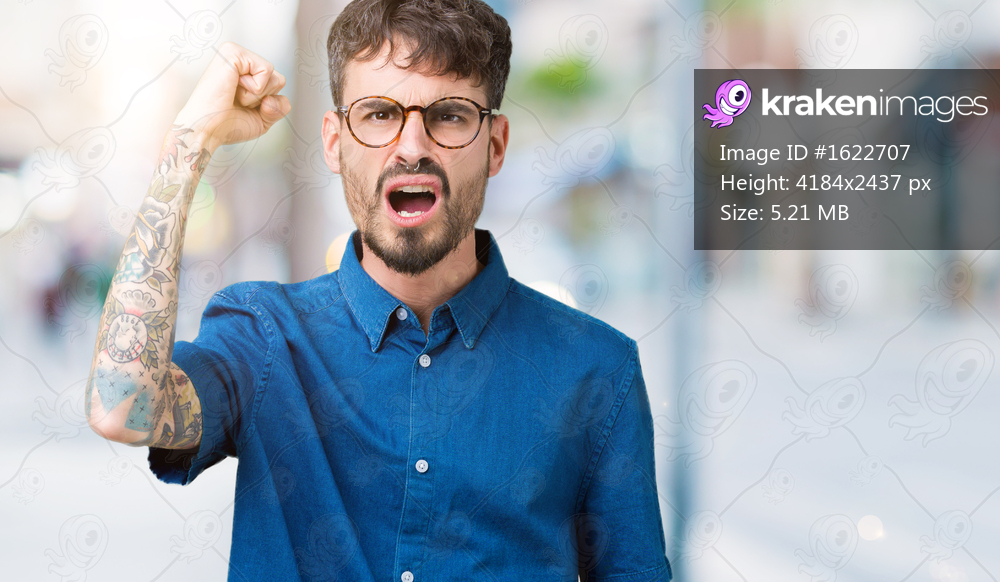 Young handsome man wearing glasses over isolated background angry and mad raising fist frustrated and furious while shouting with anger. Rage and aggressive concept. - Kraken Images