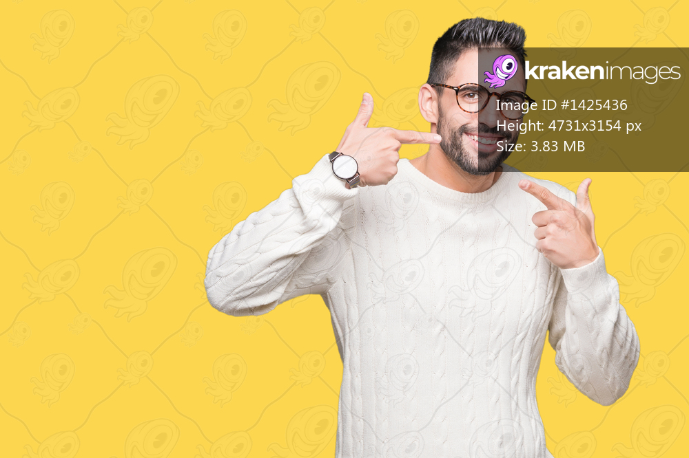Young handsome man wearing glasses over isolated background smiling confident showing and pointing with fingers teeth and mouth. Health concept.