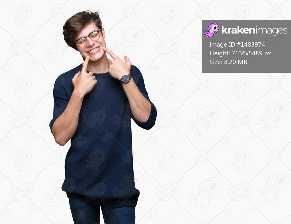 Young handsome man wearing glasses over isolated background smiling confident showing and pointing with fingers teeth and mouth. Health concept.