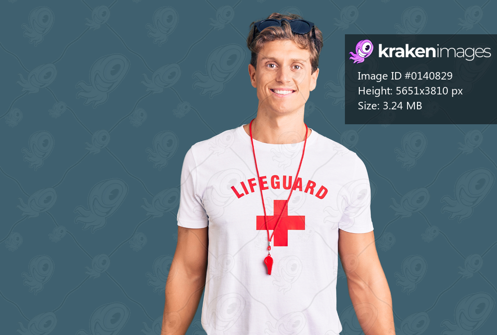 Young handsome man wearing lifeguard t shirt and whistle looking positive and happy standing and smiling with a confident smile showing teeth
