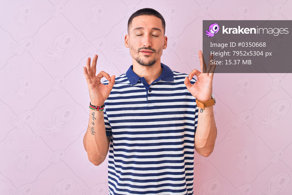 Young handsome man wearing nautical striped t-shirt over pink isolated background relax and smiling with eyes closed doing meditation gesture with fingers. Yoga concept. - Kraken Images