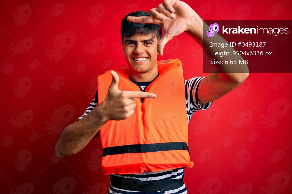 Young handsome man wearing orange safety life jacket over isolated red background smiling making frame with hands and fingers with happy face. Creativity and photography concept. - Kraken Images