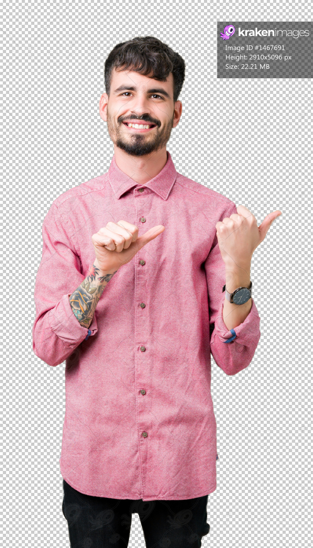 Young handsome man wearing pink shirt over isolated background Pointing to the back behind with hand and thumbs up, smiling confident