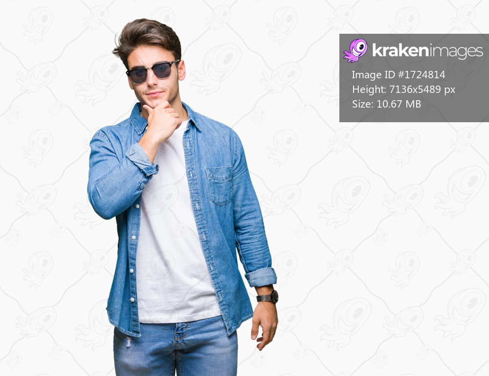 Young handsome man wearing sunglasses over isolated background looking confident at the camera with smile with crossed arms and hand raised on chin. Thinking positive. - Kraken Images