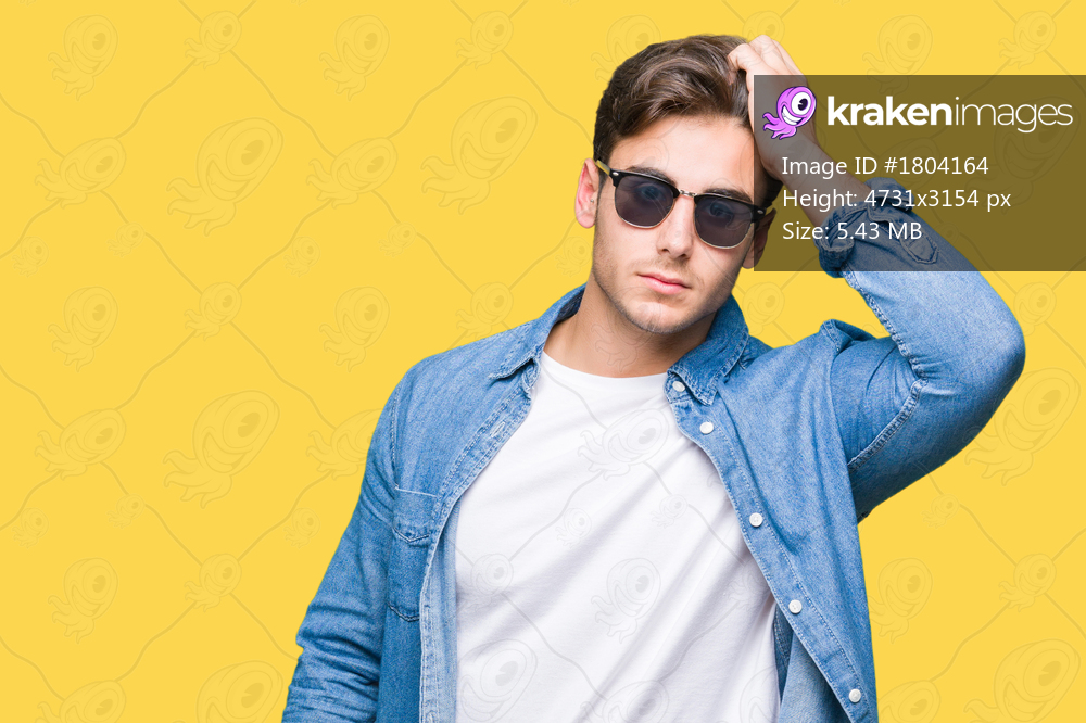 Young handsome man wearing sunglasses over isolated background Smiling confident touching hair with hand up gesture, posing attractive
