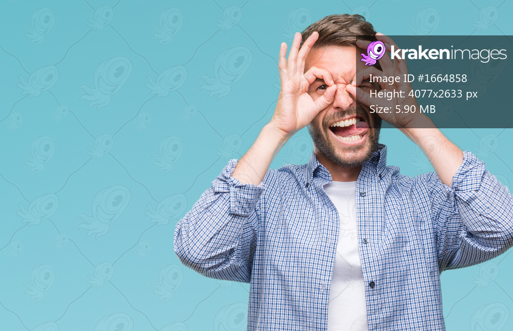 Young handsome man wearing white t-shirt over isolated background doing ok gesture like binoculars sticking tongue out, eyes looking through fingers. Crazy expression. - Kraken Images