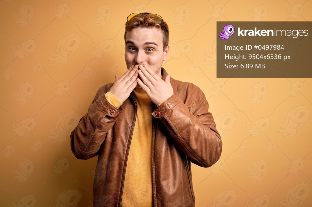 Young handsome redhead man wearing casual leather jacket over isolated yellow background laughing and embarrassed giggle covering mouth with hands, gossip and scandal concept - Kraken Images