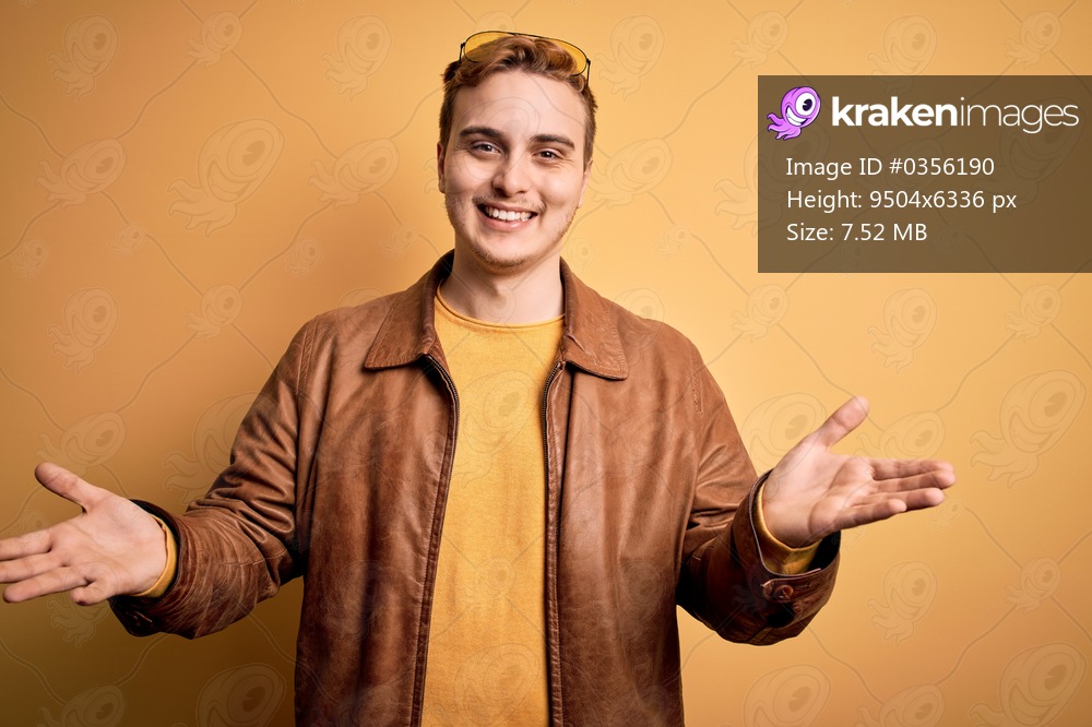 Young handsome redhead man wearing casual leather jacket over isolated yellow background smiling cheerful offering hands giving assistance and acceptance.