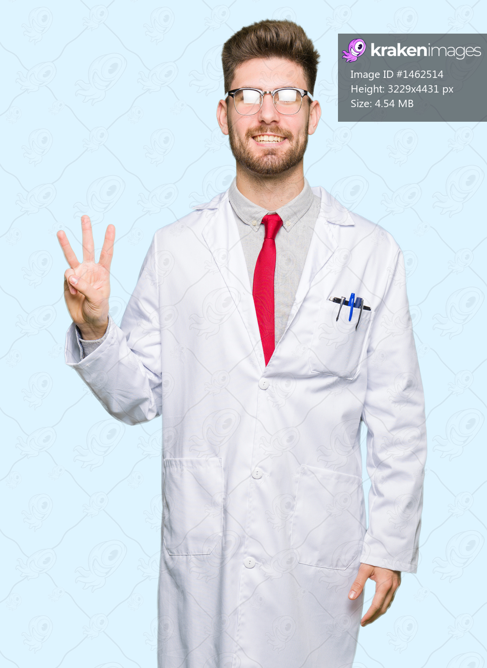 Young handsome scientist man wearing glasses showing and pointing up with fingers number three while smiling confident and happy.