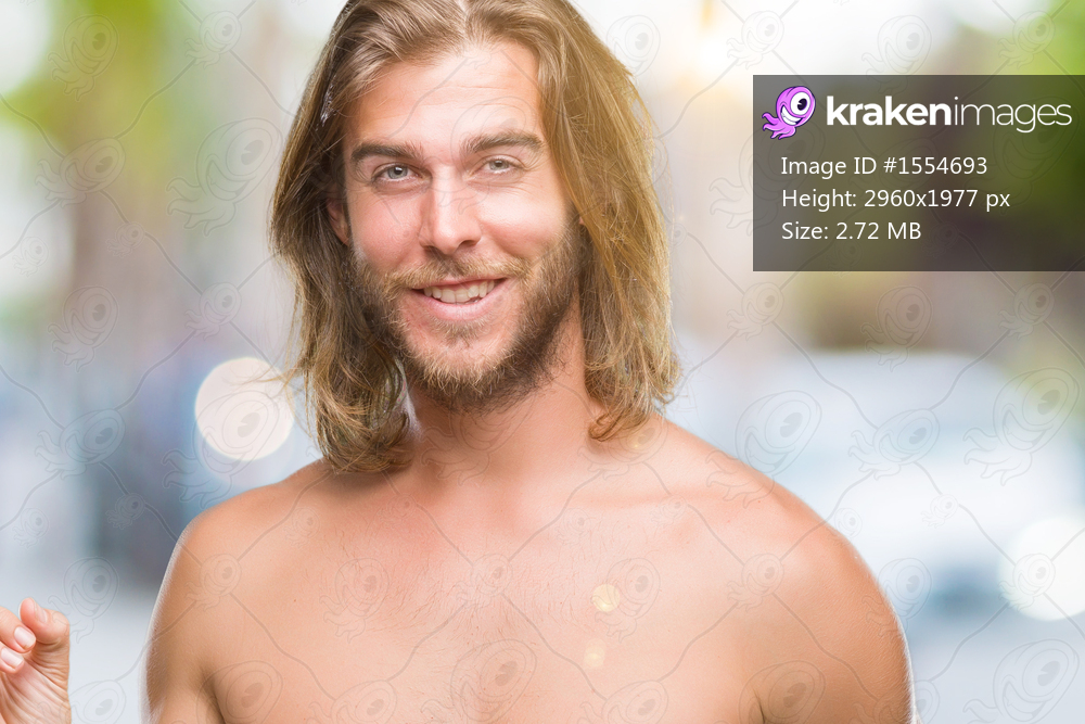 Young handsome shirtless man with long hair showing sexy body over isolated background with a big smile on face, pointing with hand and finger to the side looking at the camera. - Kraken Images