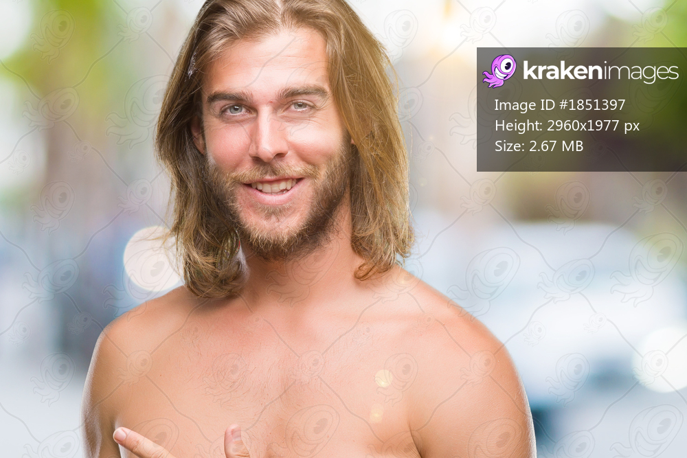 Young handsome shirtless man with long hair showing sexy body over isolated background cheerful with a smile of face pointing with hand and finger up to the side with happy and natural expression on face looking at the camera. - Kraken Images