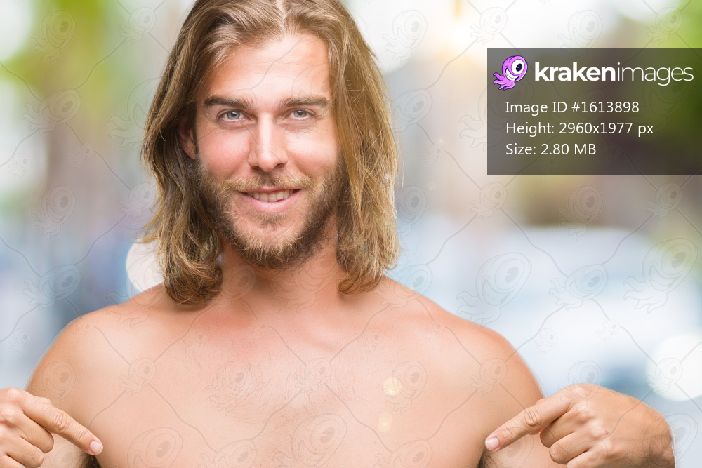 Young handsome shirtless man with long hair showing sexy body over isolated background looking confident with smile on face, pointing oneself with fingers proud and happy. - Kraken Images