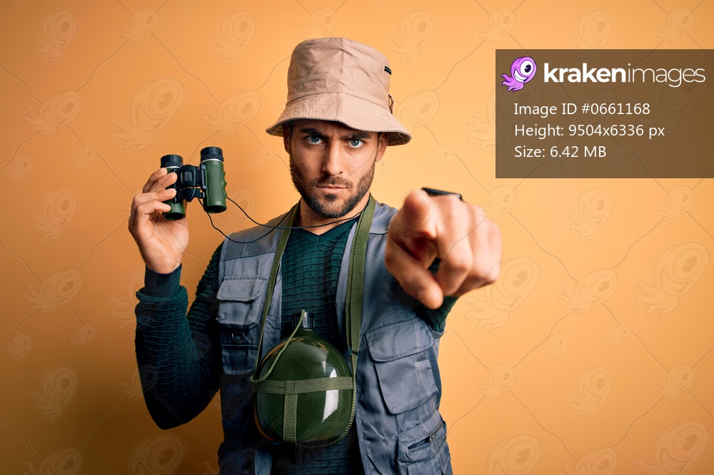 Young handsome tourist man with beard on vacation wearing explorer hat using binoculars pointing with finger to the camera and to you, hand sign, positive and confident gesture from the front - Kraken Images