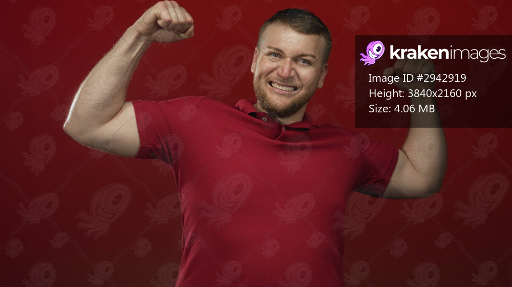 Young heavyset man flexing biceps with clenched fists in a red studio set, smiling at the lens; confidence strength.