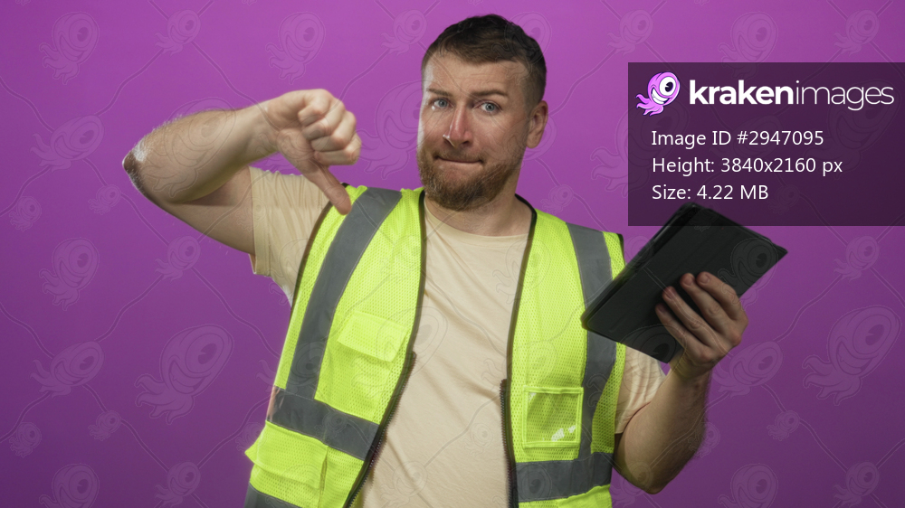 Young heavyset man wearing reflective high visibility vest holding a tablet and pointing index finger upward in a purple studio; doubt planning.