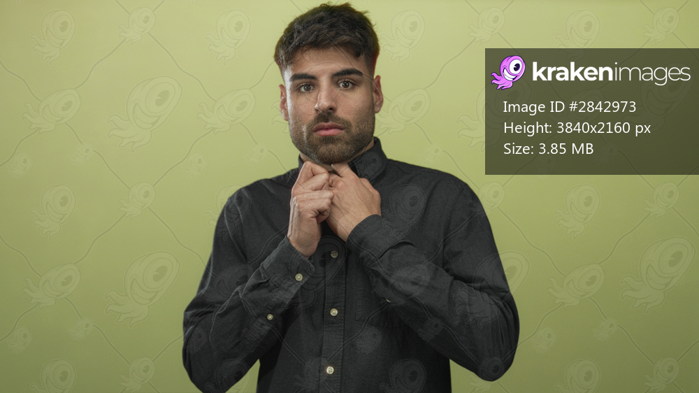 Young hesitant hispanic man buttoning shirt collar with both hands against light green wall in studio; fear anxiety dread worry.
