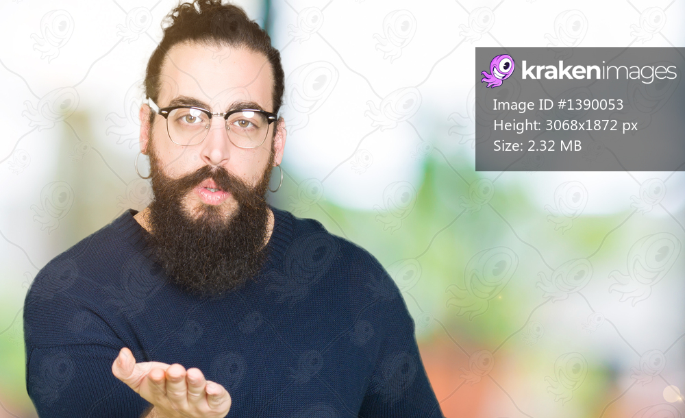 Young hipster man with long hair and beard wearing glasses looking at the camera blowing a kiss with hand on air being lovely and sexy. Love expression. - Kraken Images
