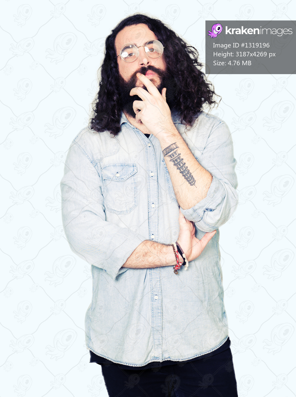 Young hipster man with long hair and beard wearing glasses looking confident at the camera with smile with crossed arms and hand raised on chin. Thinking positive. - Kraken Images